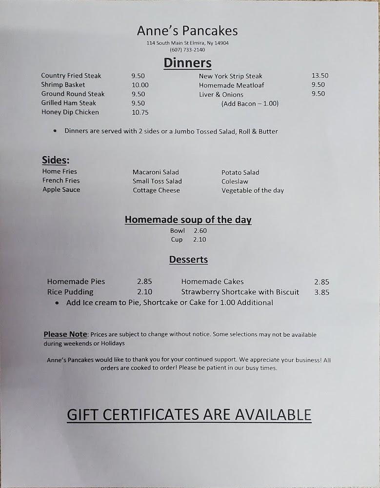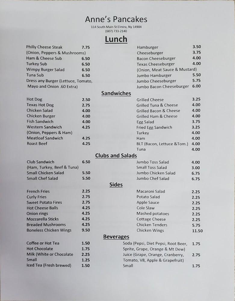 Welcome to Anne's Pancakes, your charming breakfast haven in Elmira, NY! Nestled at 114 S Main St, our cozy restaurant serves up a delightful array of traditional dishes, from fluffy pancakes to hearty brunch favorites. Enjoy our locally sourced specialties in a relaxed, historic setting, perfect for families, solo diners, and groups alike. We offer dine-in, takeout, and delivery options to suit your needs, all while ensuring accessibility for everyone. Indulge in a rich cup of coffee, and don’t forget to try our mouthwatering desserts! Join us for a delicious experience—cash only, and we gladly welcome dogs on our outdoor seating!